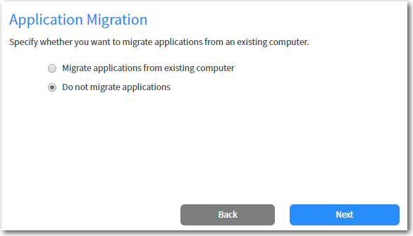 - If you want to migrate applications from an existing computer to the target computer, select the Migrate applications from existing computer option. If you select this option, the Select computer field is displayed, where you are prompted to search for the existing computer.