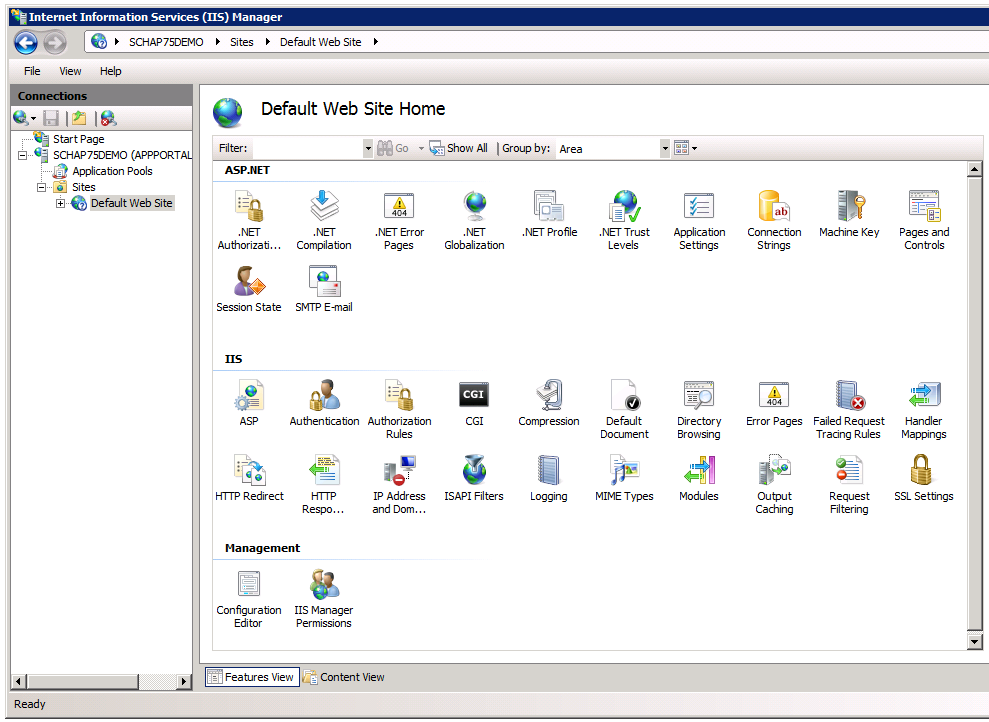 - Select Default Web Site in the tree. The Default Web Site Home view opens.